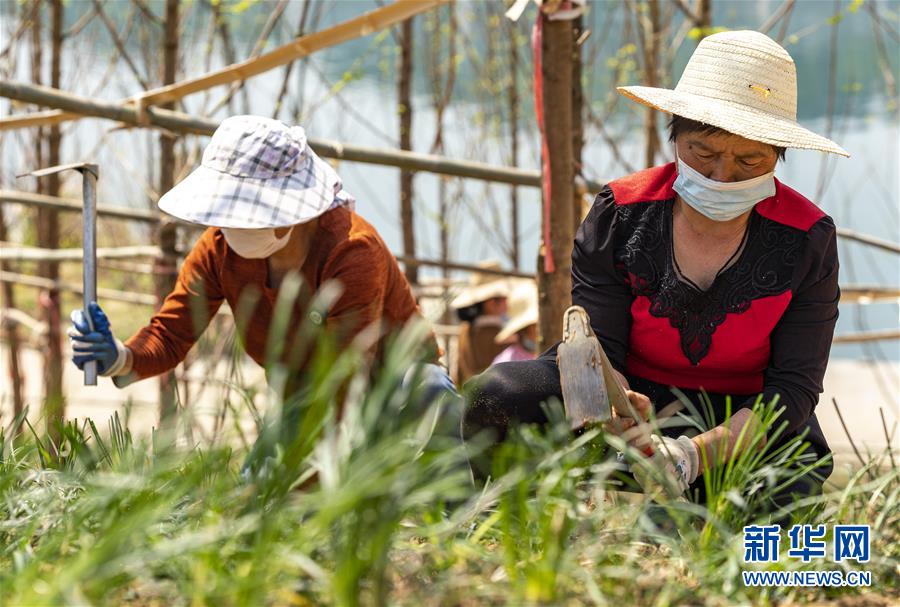 4月9日,在湖北省秭归县茅坪镇木鱼岛,工人在进行绿化栽植。 复工复产以来,三峡库区湖北省宜昌市秭归县抢抓春季和三峡水库汛期退水时机,加速对县城木鱼岛至尖棚岭段5.12公里的库岸进行治理,通过防护加固、环境整治、植被绿化等方式,确保三峡库岸安全,保护长江生态环境。 新华社发(向红梅 摄)