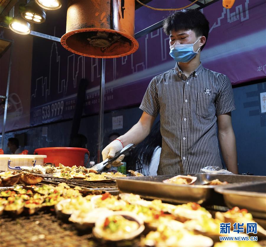 在南宁中山路夜市,商家在为游客烹制美食(4月10日摄)。新华社记者 杨驰 摄
