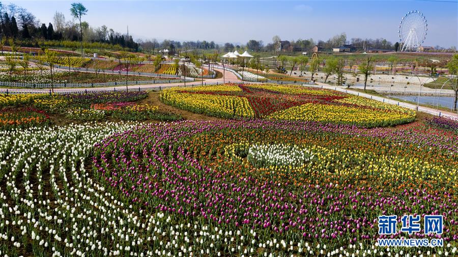 4月11日拍摄的洛南县锦绣大地花博园内盛开的郁金香(无人机照片)。新华社记者 陶明 摄