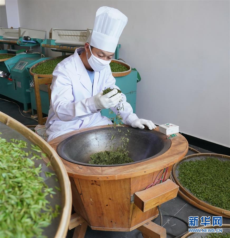 4月11日,灵寿县南营乡东寺岭村盘龙湾茶叶专业合作社的炒茶师在炒制茶叶。 近日,地处太行山区的河北省灵寿县南营乡的茶园开园采茶。灵寿县南营乡的茶树于1998年从杭州移植而来,通过“公司+农户+合作社+基地”的方式发展,建成500多亩的高标准茶叶基地,形成产、供、销一条龙的集约化经营方式,有效带动当地近千余村民脱贫致富。 新华社记者 杨世尧 摄