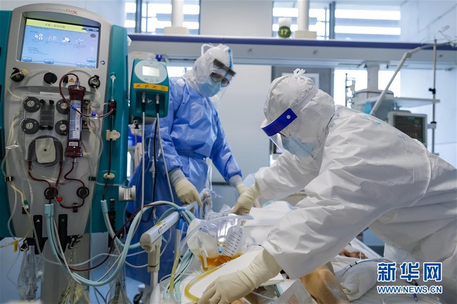 4月11日,在华中科技大学同济医学院附属同济医院中法新城院区ICU病房,北京协和医院内科ICU护士长夏莹(右)为一名新冠肺炎危重症患者更换体位。 新华社记者 沈伯韩 摄