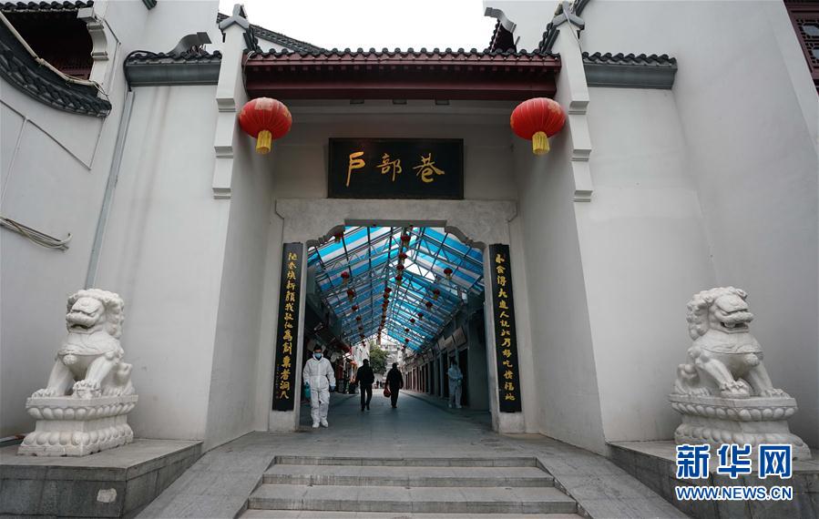 4月11日,工作人员在武汉户部巷进行消杀作业。 当日,武汉知名小吃街户部巷开展例行消杀作业。 新华社记者 王毓国 摄