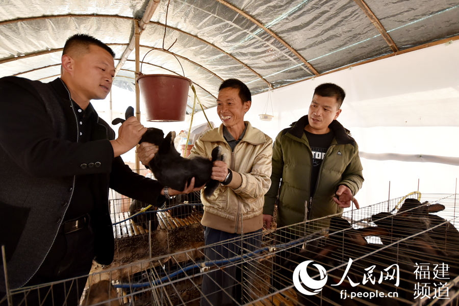镇、村干部和技术员指导林生平饲养种兔。许华森摄