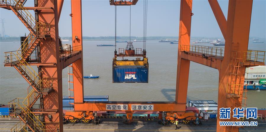 4月12日,武汉长江中游航运中心核心港阳逻港加紧装载作业。 新华社记者肖艺九摄 图片来源:新华网