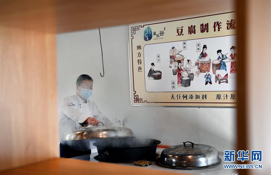 4月12日,村民刘建锋在“亲农·溪乐谷”美丽乡村的豆腐坊里制作豆浆。原为贫困户的刘建锋在住处搬迁到集镇后,在改造后的老宅里专门为游人制作豆浆,每月工资1800元。 陕西省商洛市洛南县保安镇北斗村高砭组地处秦岭深处,2019年初,作为苏陕协作的重点项目,当地政府利用高砭组易地移民整体搬迁留下的民居开发“亲农·溪乐谷”美丽乡村项目。该项目由南京市江宁区支援3000万元,由南京市江宁交建集团派出规划、设计、施工队伍支援建设,已于2019年底开园运营。据介绍,该项目通过土地流转、房屋租赁、务工、分红等多种形式,可帮助50余户贫困户长期稳定增收。 新华社记者 陶明 摄