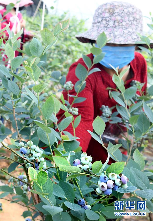 4月12日,沂水县杨庄镇西山根村果农在大棚里采摘蓝莓。新华社记者 李紫恒 摄