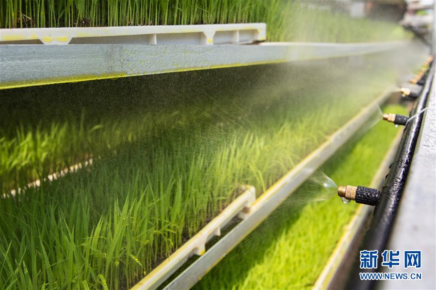 4月12日,在宁乡双江口镇育秧工厂,自动浇水设备给秧苗浇水。 春耕时节,湖南宁乡市双江口镇水稻种植联合社的集中育秧工厂抢抓农时,抓紧育秧育苗工作。据了解,该育秧工厂可为当地农民提供种子催芽和育秧等服务,采用这种工厂化育秧比传统育秧每亩要节省100到150元。 新华社发(陈思汗摄)