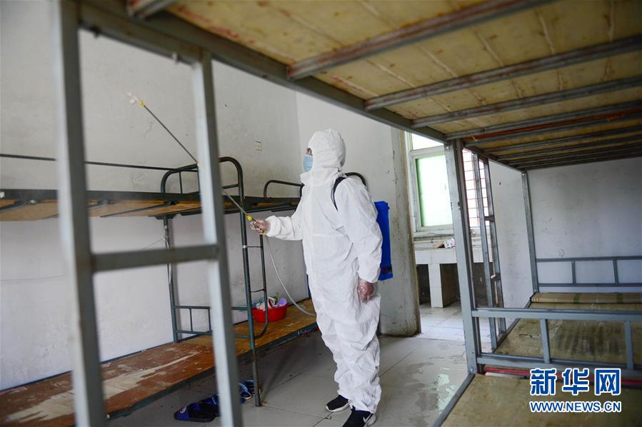 4月12日,在河南省驻马店市汝南双语学校,工作人员对学生宿舍进行消杀。 目前,随着疫情防控形势持续向好,部分地区中小学校组织人员开展校园消杀作业,发放教材,为学生复课做好准备。 新华社发(孙凯 摄)
