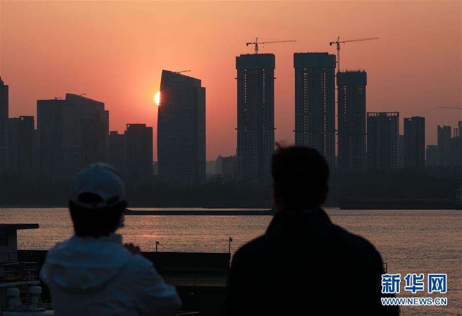 4月12日,人们在武汉市武昌区江滩欣赏落日美景。 武汉逐渐“重启”,长江两岸的夜景依然华美,过去两个多月“沉睡”的城市正在复苏。 新华社发(赵军 摄)