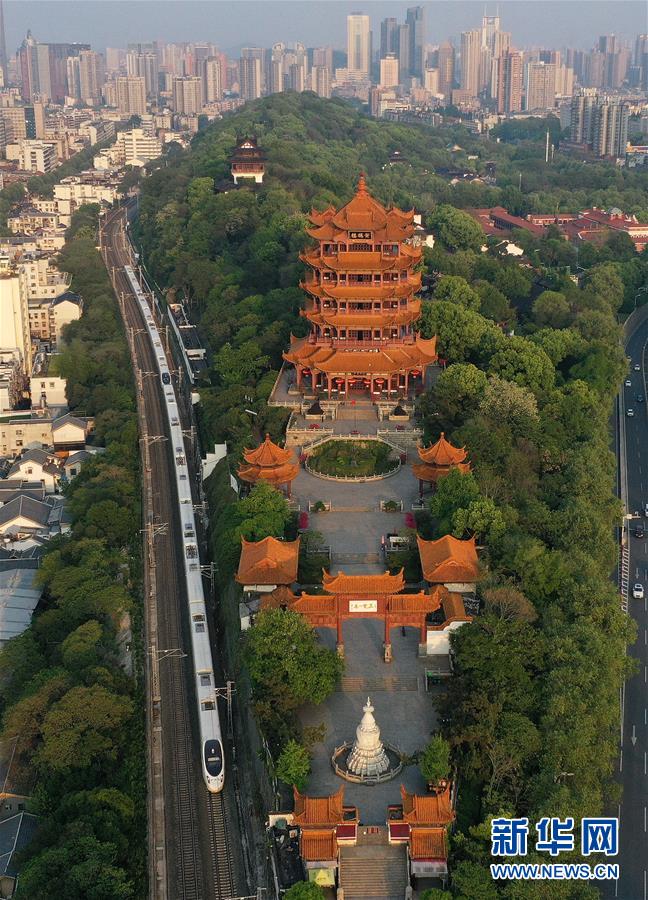 4月12日,一列动车组经过武汉黄鹤楼(无人机照片)。 武汉逐渐“重启”,长江两岸的夜景依然华美,过去两个多月“沉睡”的城市正在复苏。 新华社发(赵军 摄)