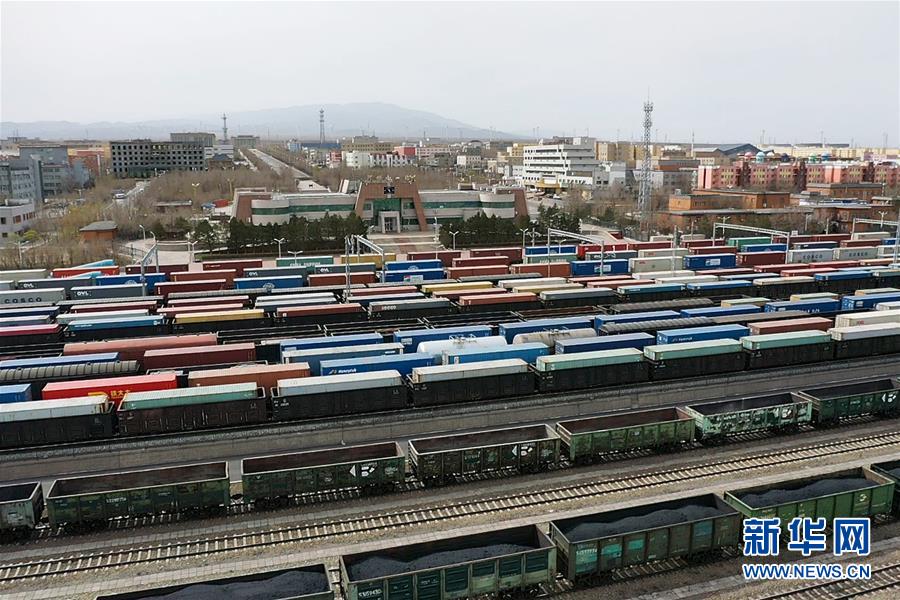 这是阿拉山口铁路到发线上准备出口的货物(4月11日摄,无人机照片)。 阿拉山口口岸是中欧班列向西出境的主要通道。面对疫情在境外的蔓延,当地海关、边检等多部门对入境车辆人员信息共享,精准研判风险信息,同时严格落实体温检测、健康申报、交通工具消毒等工作,严防境外疫情输入。 新华社记者 沙达提 摄