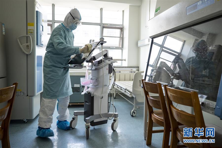 4月12日,在华中科技大学同济医学院附属同济医院中法新城院区C栋9层病区,所有病人均被转出后,一名北京协和医院医疗队队员在整理新冠肺炎危重症患者使用过的医疗器械。 新华社记者 沈伯韩 摄