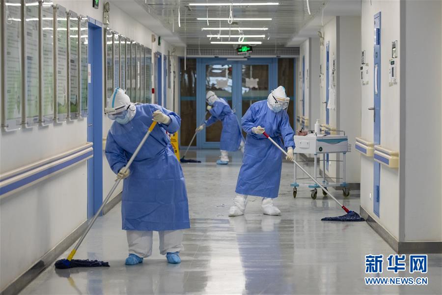 4月12日,在华中科技大学同济医学院附属同济医院中法新城院区C栋9层病区,所有病人均被转出后,保洁人员在清洁新冠肺炎危重症患者病区。 新华社记者 沈伯韩 摄