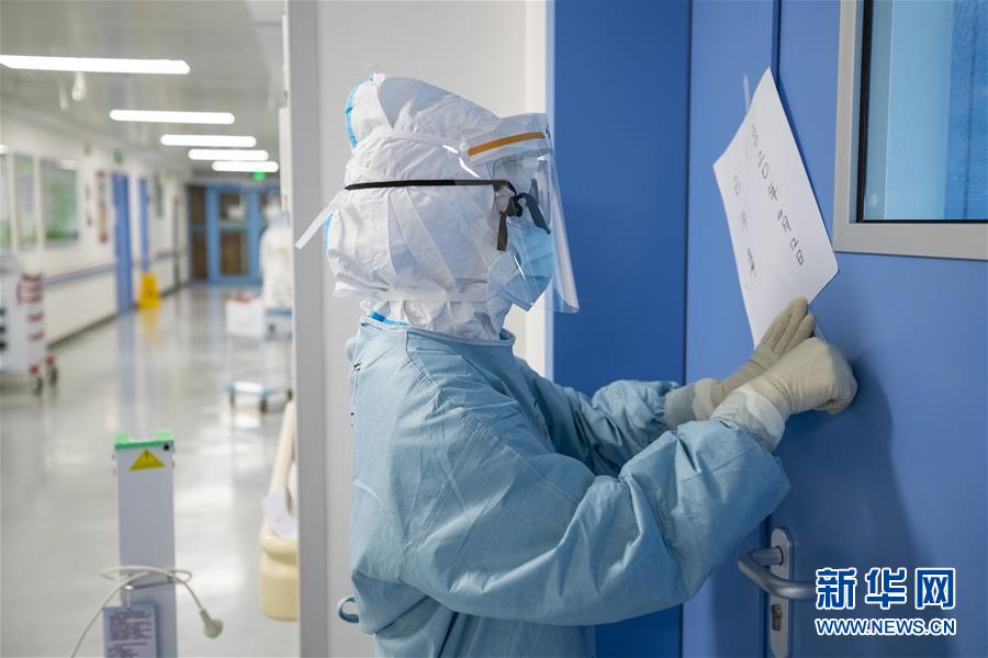 4月12日,在华中科技大学同济医学院附属同济医院中法新城院区C栋9层病区,所有病人均被转出后,该院医务人员李湘怡将消杀过的病房贴上封条。 新华社记者 沈伯韩 摄