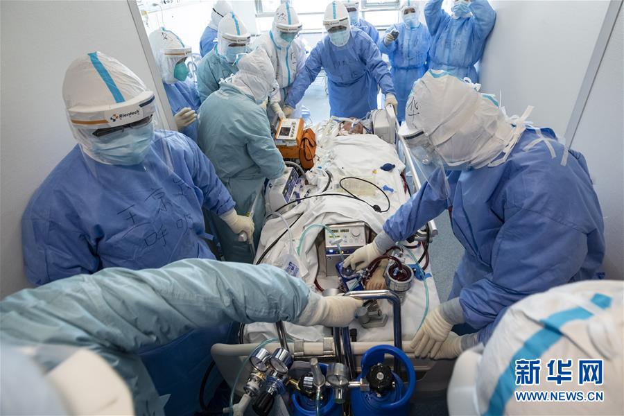 4月12日,北京协和医院医疗队队员与武汉同济医院医务人员共同将一名新冠肺炎危重症患者转往武汉同济医院中法新城院区ICU。在转运过程中,体外膜肺氧合(ECMO)治疗仍在持续进行。 新华社记者 沈伯韩 摄