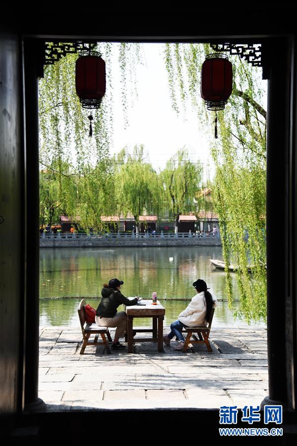 4月13日,游客在济南百花洲历史文化街区沿街座位上作画。新华社记者 王凯 摄