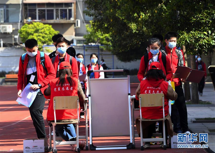 4月13日,在郑州外国语中学,学生在排队登记信息。新华社记者 郝源 摄