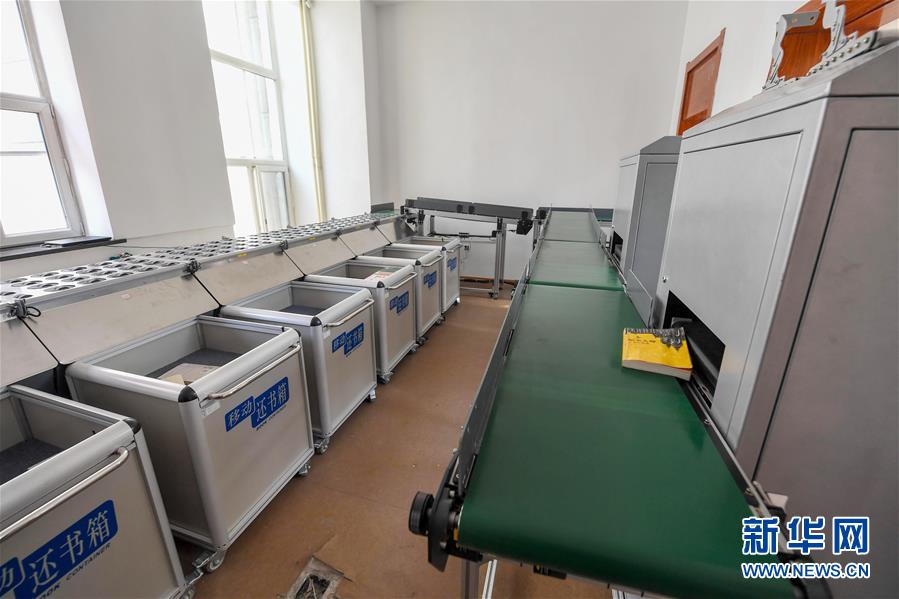 4月13日,在长春市图书馆,图书自助分拣系统用传送带将图书投到指定的还书箱。新华社记者 张楠 摄