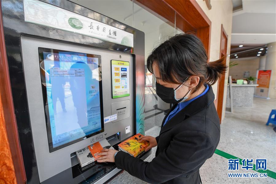 4月13日,在长春市图书馆,读者使用图书自助分拣系统还书。新华社记者 张楠 摄