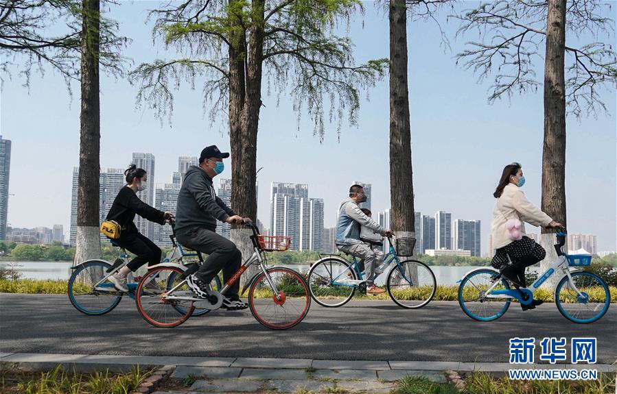 4月13日,人们在武汉东湖绿道骑车休闲。 随着疫情防控形势好转,武汉绿道上健身休闲的人渐渐多了起来。 新华社记者 程敏 摄