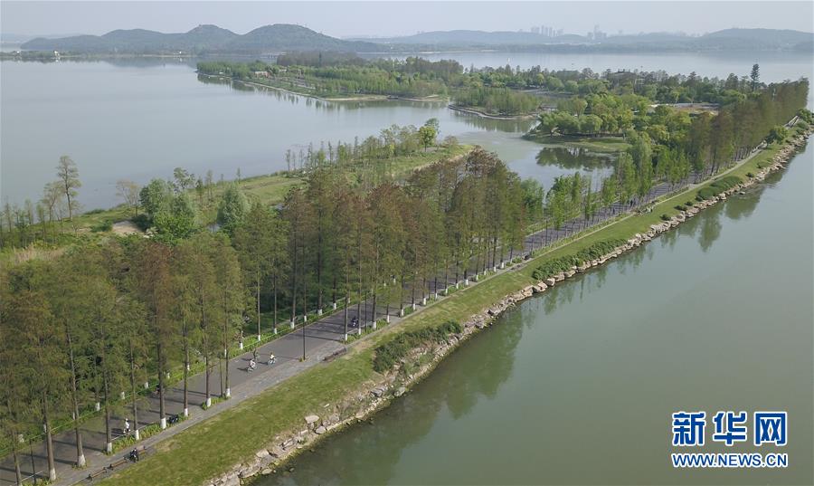 4月13日,人们在武汉东湖绿道休闲(无人机照片)。 随着疫情防控形势好转,武汉绿道上健身休闲的人渐渐多了起来。 新华社记者 程敏 摄