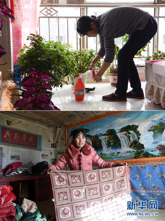 拼版照片:上图为胥存在古浪县绿洲生态移民小城镇的家中给客厅里的花浇水(4月7日摄);下图为胥存在古浪县黄羊川镇石城村的家中叠床单(2018年2月6日摄)。新华社记者 范培珅 摄