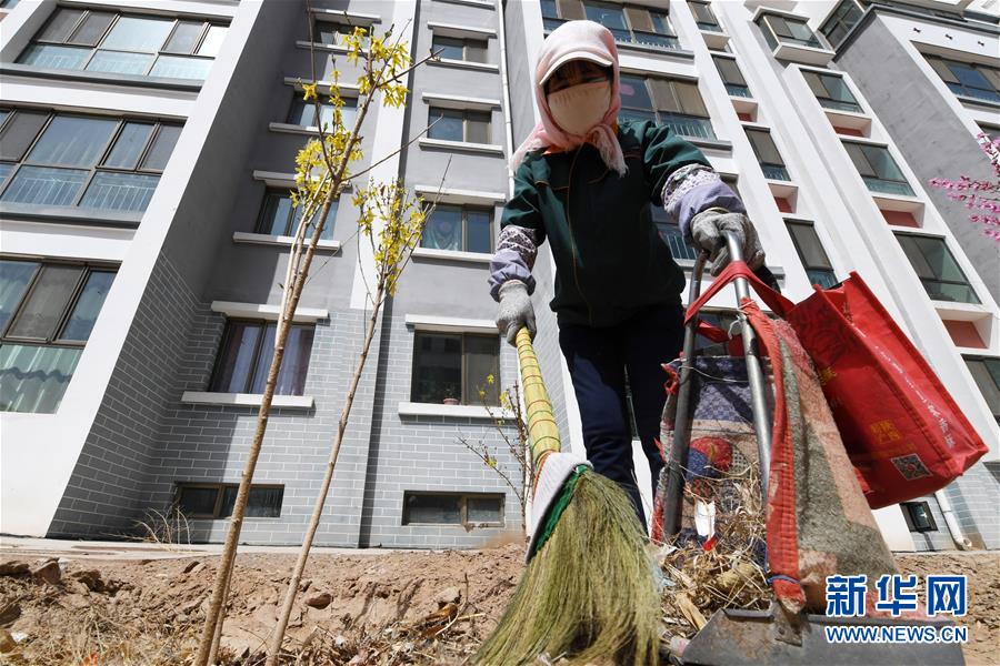 在古浪县绿洲生态移民小城镇,胥存打扫小城镇花园卫生(4月7日摄)。新华社记者 范培珅 摄