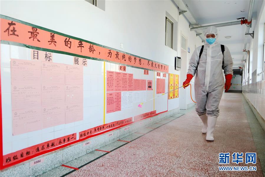 4月13日,山东省青岛西海岸新区实验高级中学工作人员对教学楼走廊进行消毒。 山东省高中毕业年级将于4月15日正式开学复课,青岛西海岸新区各学校积极做好各项准备工作,确保学生和教职员工的健康安全。 新华社发(王培珂 摄)