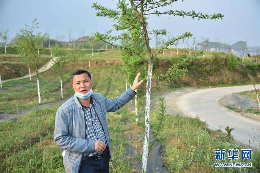包村干部、贵州省毕节市织金县马场镇党委副书记蔡勇介绍新种植的树木(3月25日摄)。 新华社记者 骆飞 摄