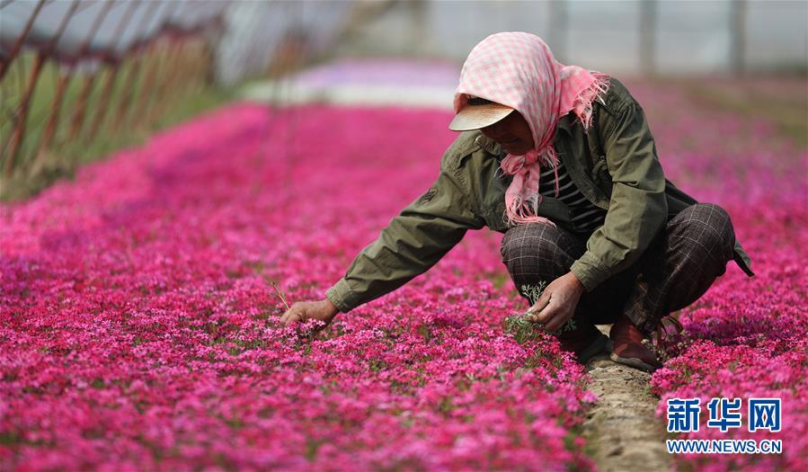 4月13日,在八角台街道雅化村花圃内,花农为培育的宿根花卉除草。新华社记者 姚剑锋 摄