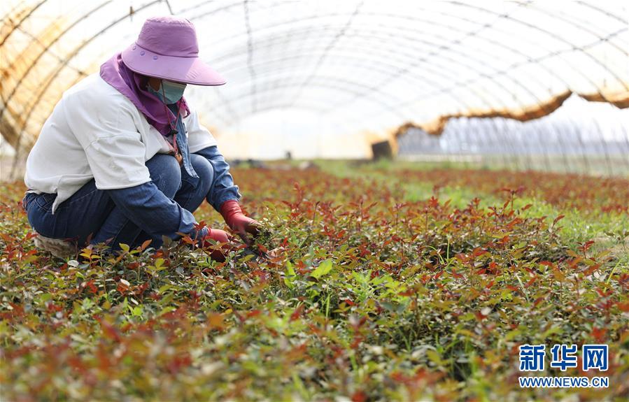 4月13日,在八角台街道雅化村花圃内,一名花农整理宿根花卉。新华社记者 姚剑锋 摄