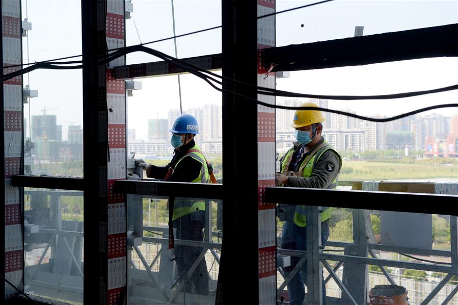 4月13日,工作人员在中科院量子信息与量子科技创新研究院施工项目现场安装玻璃幕墙。 近日,由中建八局承建的中科院量子信息与量子科技创新研究院施工项目全面复工。工作人员在做好疫情防控的基础上加紧施工,保障工程进度稳步推进。 新华社发(黄博涵 摄)