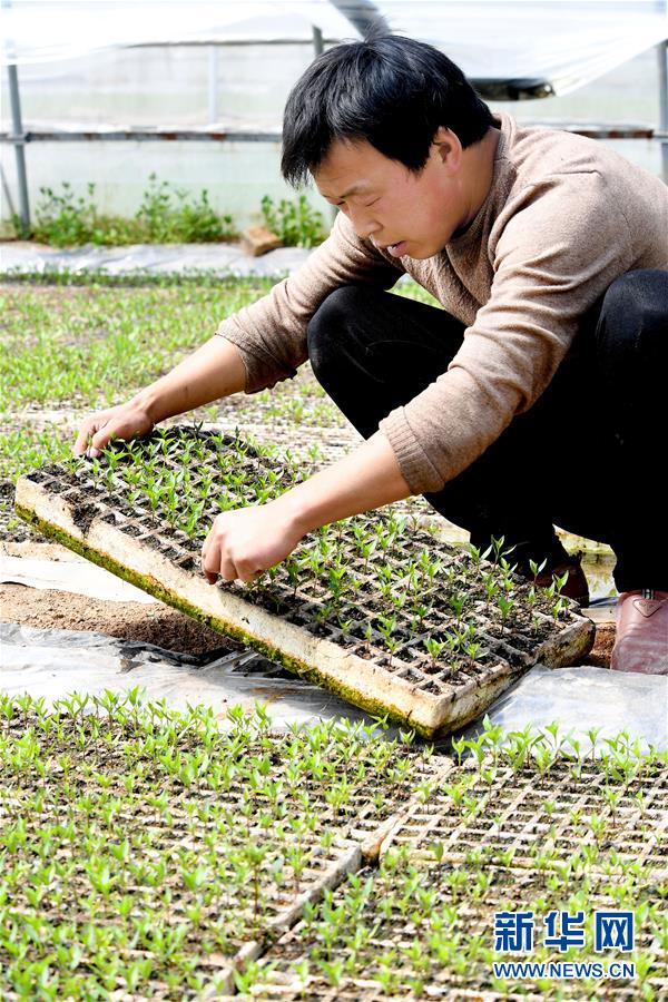 4月13日,在洛南县麻坪镇三兴村辣上天育苗合作点,村民张红在检查育苗情况。新华社记者 陶明 摄