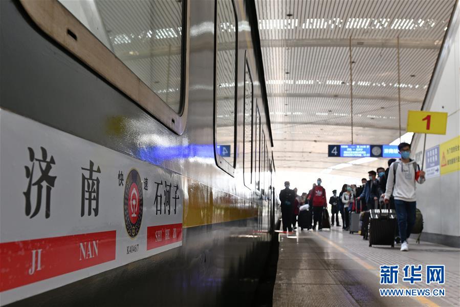 4月13日,在济南火车站,石河子大学学生准备登上K4046次列车。新华社记者 朱峥 摄