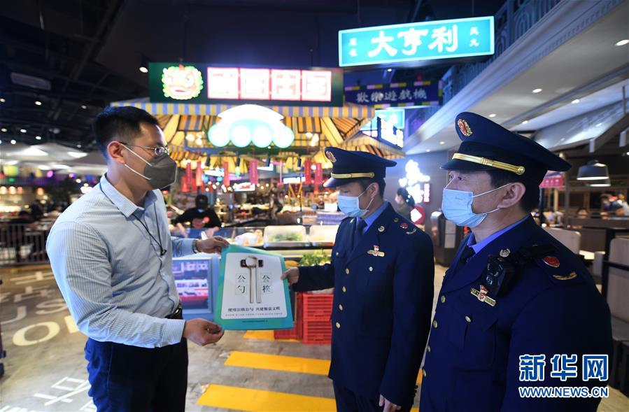 4月13日,石家庄市桥西区市场监督管理局工作人员向餐饮商户发放提倡公勺公筷的宣传材料。 近日,河北省印发《河北省餐饮业分餐制、公勺公筷服务规范》,对分餐制和公勺公筷的使用等作出具体规定,引导市民养成健康文明的餐饮习惯。 新华社记者 王晓 摄