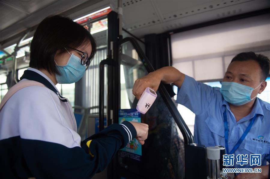 4月13日,在“校园公交专线”公交车上,司机为上车的学生测量体温。新华社发(张丽芸 摄)