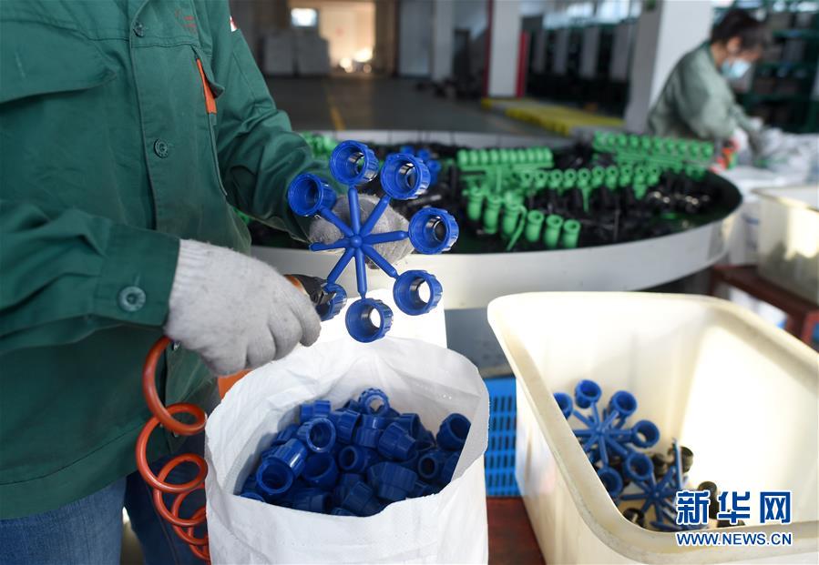 4月13日,员工在位于店口镇的诸暨市风帆管业有限公司注塑车间分拣自动化生产线上的管件。新华社记者 韩传号 摄