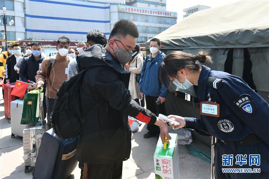 4月13日,在济南火车站广场,石河子大学学生接受体温检测,准备进站。新华社记者 朱峥 摄