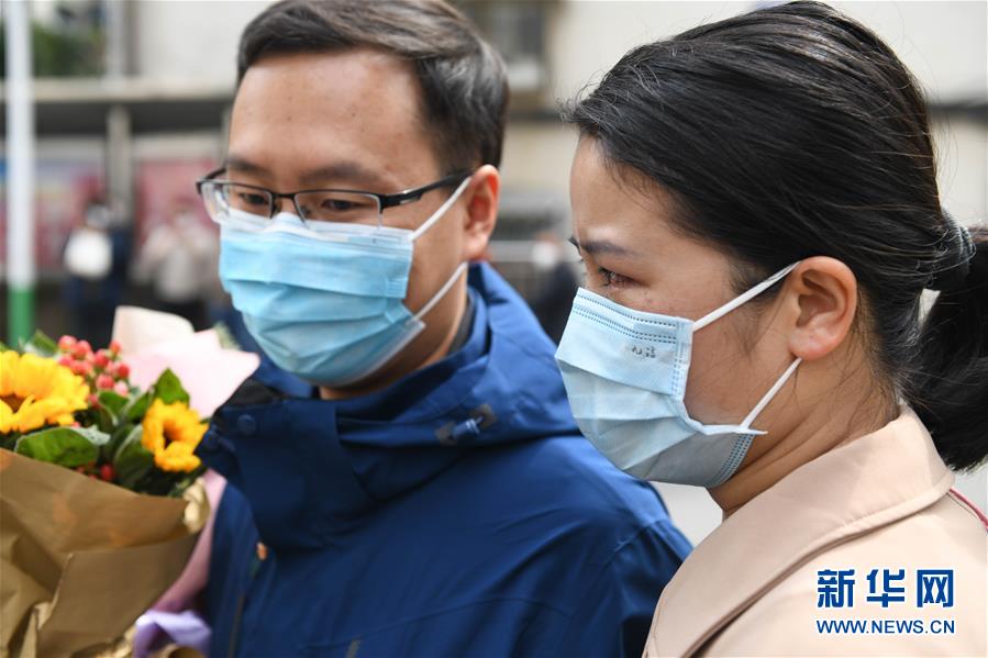 4月14日,在安徽医科大学第一附属医院,援鄂医疗队员刘钢(左)与妻子吴乐在一起。 当日,安徽医科大学第一附属医院的5名援鄂医疗队员休整期满,解除集中隔离,与前来迎接的家人团聚。1月27日,这5名医护人员随安徽省首批支援湖北医疗队奔赴武汉,3月31日从武汉返回合肥。 新华社记者 张端 摄