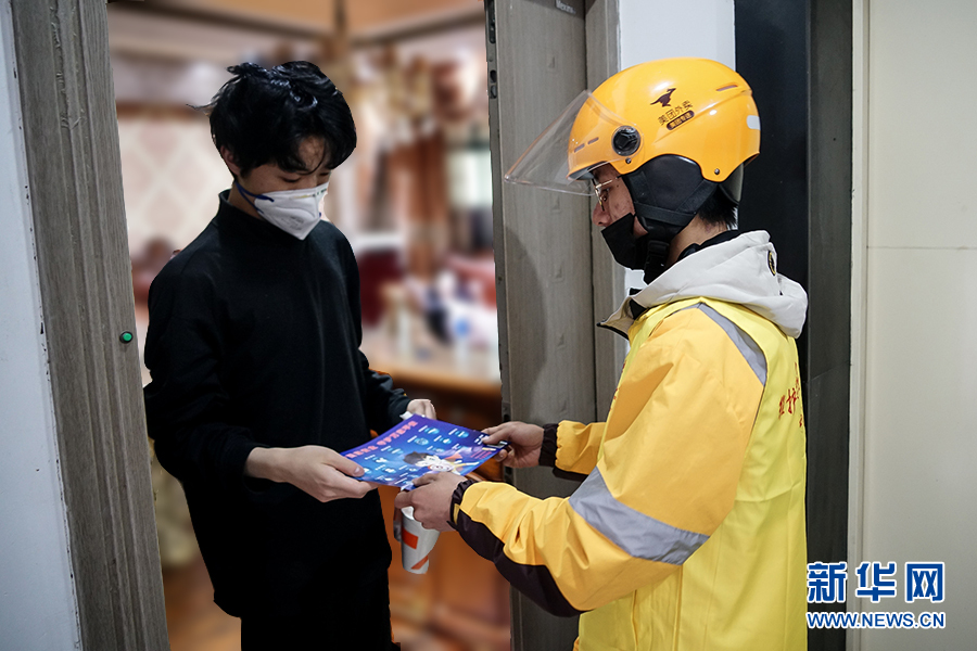 敲开门后,王淞把宣传单和餐饮品一起交给了点餐的顾客,并告诉他可以扫描宣传单上的二维码参与微信动漫小游戏进行答题,了解国家安全知识。新华网 韩梦霖 摄