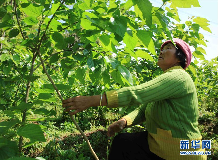 4月14日,在湖南省张家界市桑植县洪家关白族乡思家生态农场,农民为桑葚树搭支架。新华社发(吴勇兵 摄)