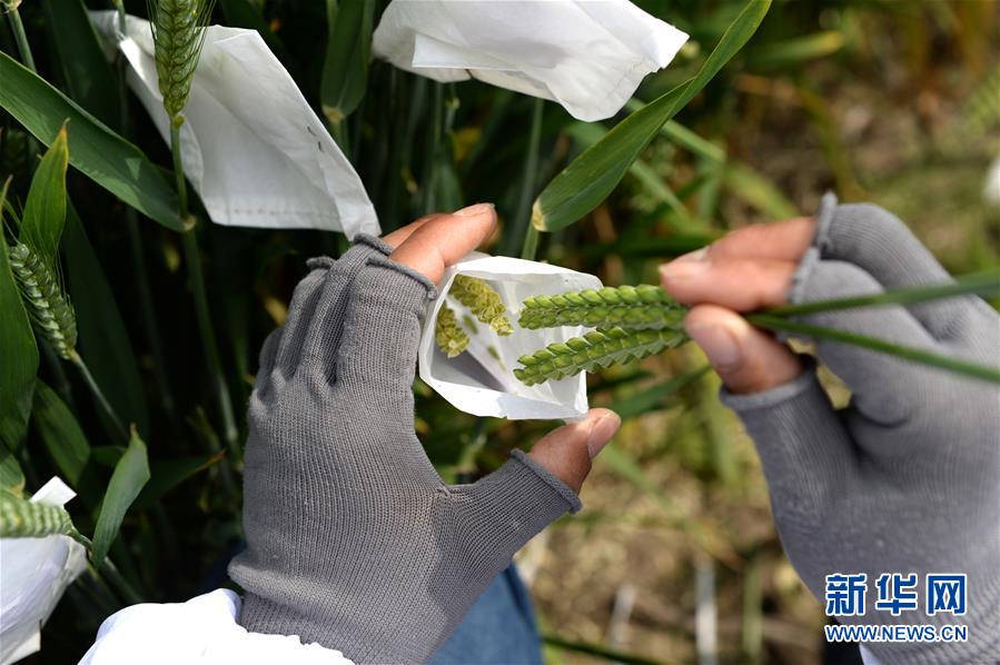 4月14日,工作人员在小麦育种试验田给小麦杂交授粉。 眼下正值安徽省怀远县冬小麦抽穗扬花期。在安徽省农垦集团龙亢农场小麦育种试验田,农业科研人员抢抓农时对小麦进行杂交授粉,以培育优良品种。 新华社发(黄博涵 摄)