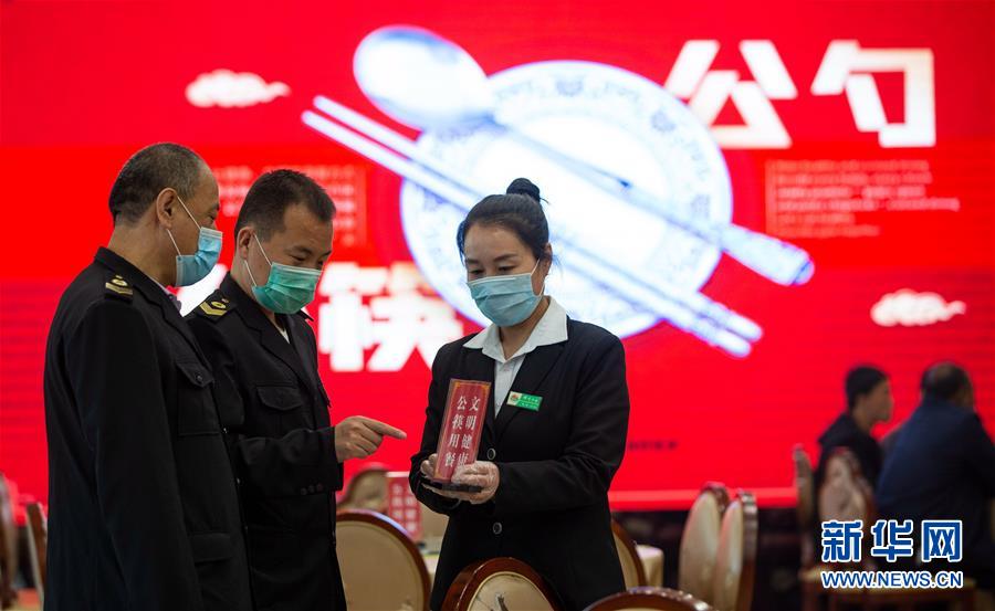 4月14日,河北武安市市场监督管理局的工作人员在一家餐厅查看“公筷用餐”标示牌。 近日,河北省商务厅、省市场监管局、省文化和旅游厅、省文明办联合制定印发《河北省餐饮业分餐制、公勺公筷服务规范》,对分餐制的分餐形式及服务要求等内容作出了规定。记者在河北省武安市走访时发现,推行“公筷用餐”,餐饮业已开始行动起来。 新华社记者 王晓 摄