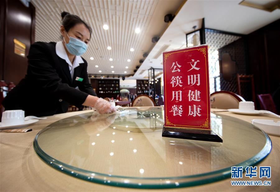 4月14日,河北武安市一家餐厅的工作人员在摆放公筷公勺。 近日,河北省商务厅、省市场监管局、省文化和旅游厅、省文明办联合制定印发《河北省餐饮业分餐制、公勺公筷服务规范》,对分餐制的分餐形式及服务要求等内容作出了规定。记者在河北省武安市走访时发现,推行“公筷用餐”,餐饮业已开始行动起来。 新华社记者 王晓 摄
