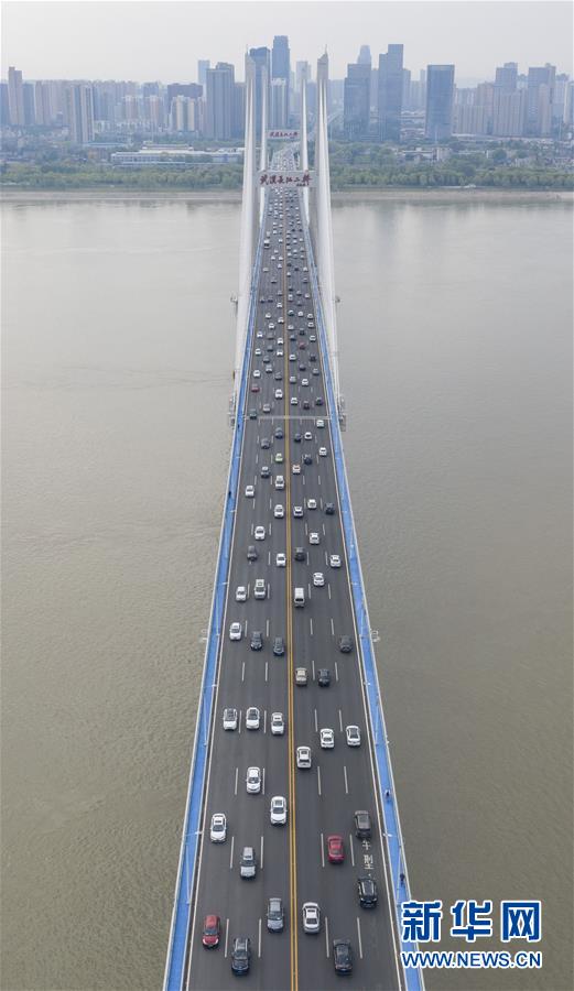 4月14日,武汉长江二桥上车流如织(无人机照片)。 随着疫情防控形势好转,武汉市内交通逐渐恢复,车辆日益增多。 新华社记者 才扬 摄
