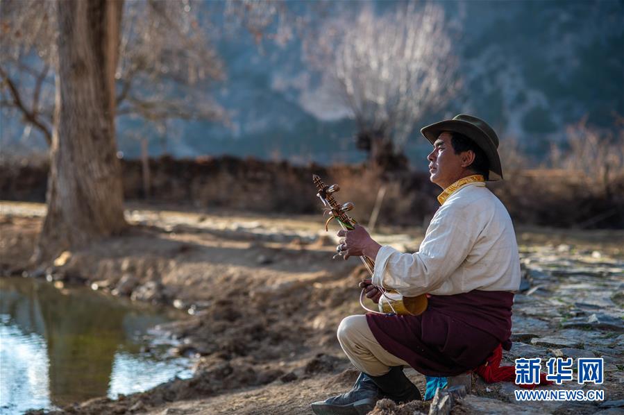 3月14日,斯那定主在说打湖边拉弦子。新华社记者胡超摄