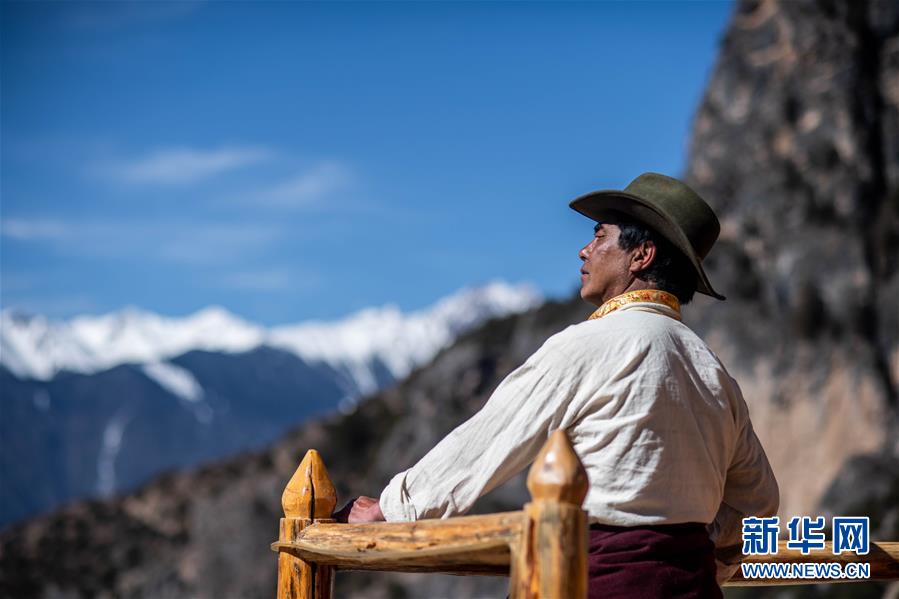 3月14日,斯那定主站在家里屋顶眺望梅里雪山。新华社记者胡超 摄