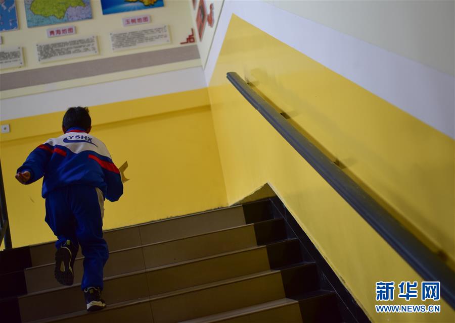 4月3日,兰军生格上课前跑回教室。 新华社记者 吴刚 摄