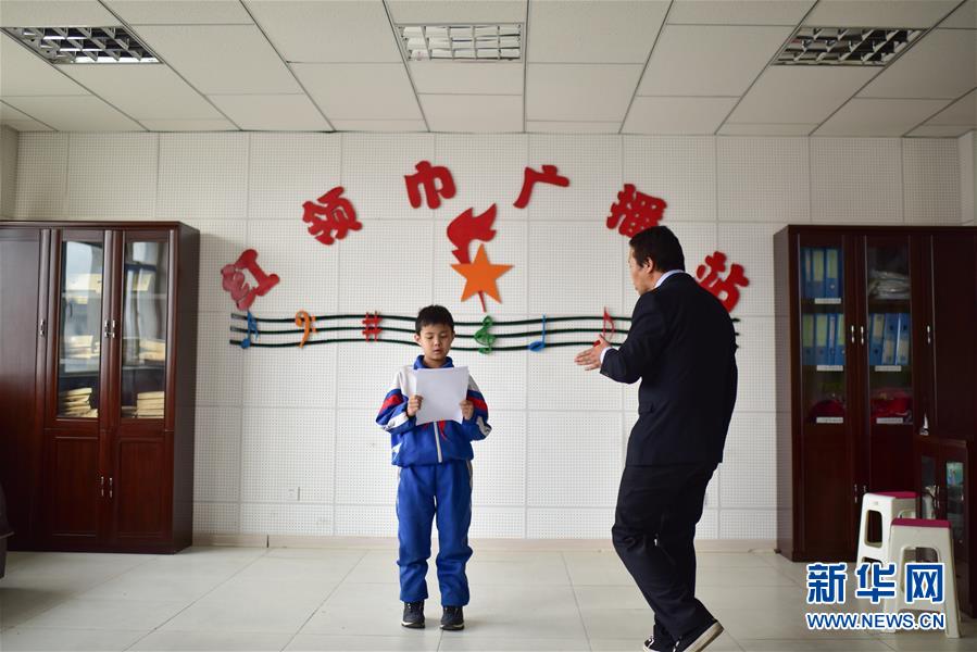 4月3日,兰军生格在老师帮助下准备关于玉树抗震救灾十周年的演讲。 新华社记者 吴刚 摄