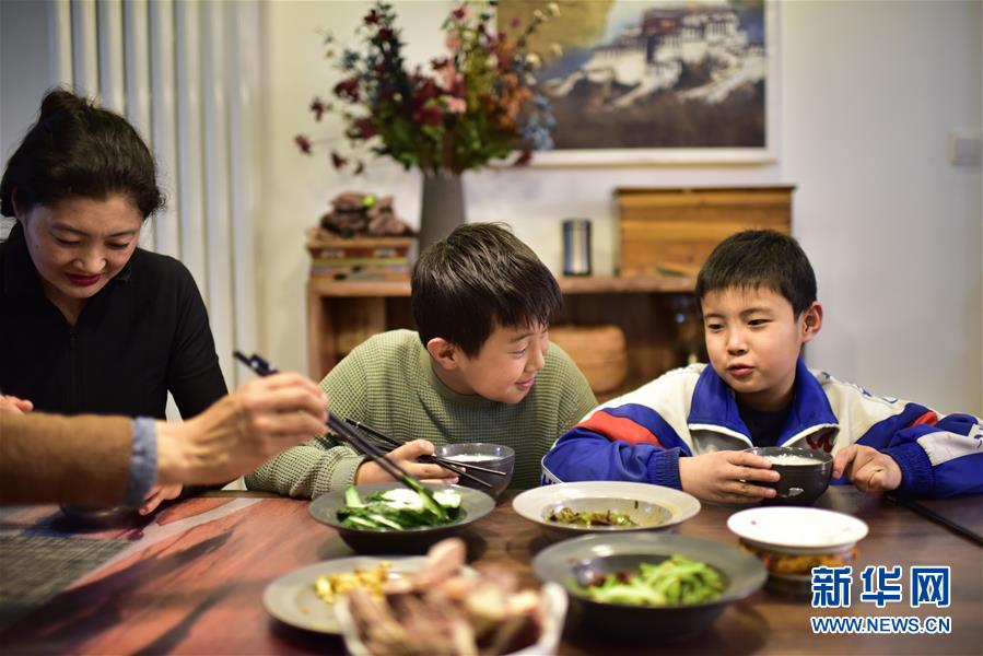 4月3日,兰军生格(右一)吃晚饭时和家人交谈。新华社记者 吴刚 摄